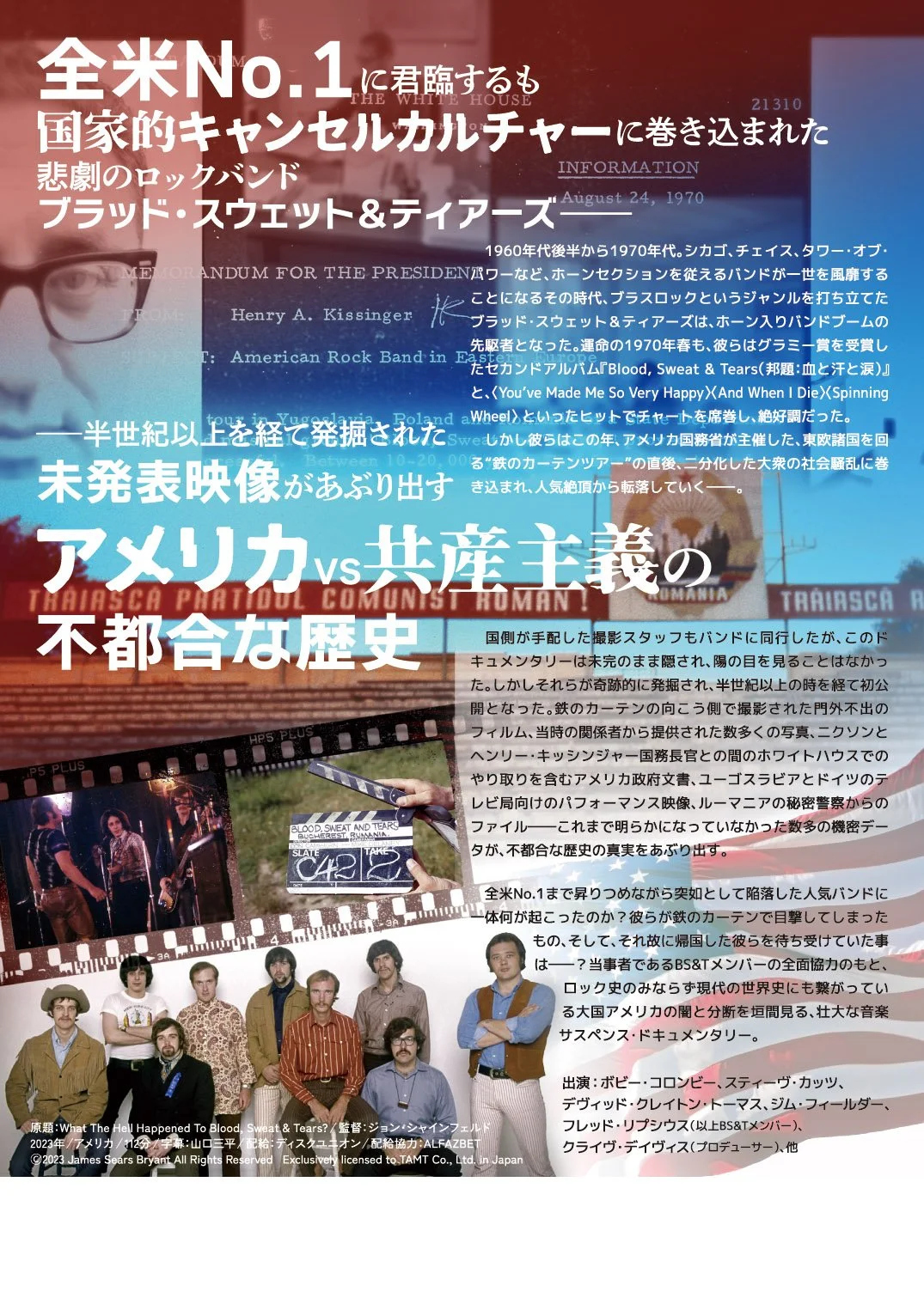 全米No.1まで昇りつめながら突如として陥落した人気バンドに一体何が起こったのか? 彼らが鉄のカーテンで目撃してしまったもの、そして、それ故に帰国した彼らを待ち受けていた事は――? 当事者であるBS&Tメンバーの全面協力のもと、ロック史のみならず現代の世界史にも繋がっている大国アメリカの闇と分断を垣間見る、壮大な音楽サスペンス・ドキュメンタリー。
